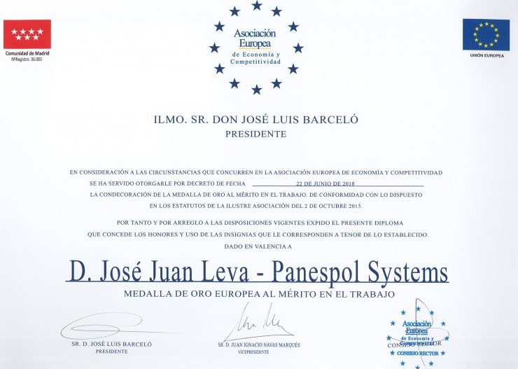 18 julio, 2018La empresa alcoyana, Panespol Systems ha recibido por parte de la Asociación Europea de Economía y Competitividad (AEDEEC), la Medalla de Oro Europea del Mérito al Trabajo, galardonando a su gerente, José Juan Leva.