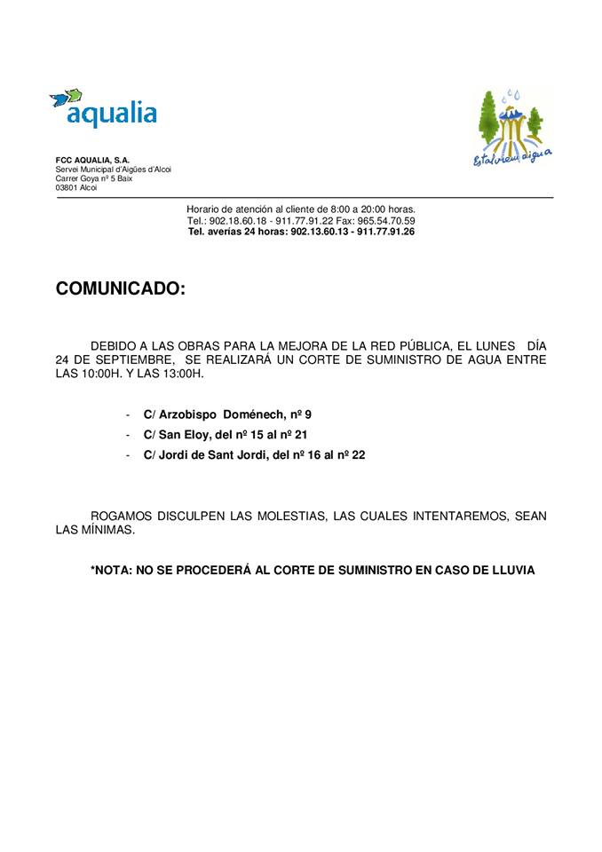 AQUALIA PROCEDERÁ A UN CORTE DE SUMINISTRO PARA LA MEJORA DE LA RED PÚBLICA