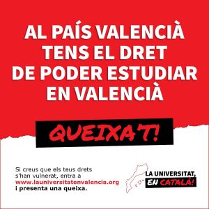 «La universitat, en valencià!» és una nova campanya de normalització per facilitar les denúncies per vulneracions lingüístiques a la universitat i per sensibilitzar els estudiants dels drets dels valencianoparlants. Impulsada per Plataforma per la Llengua, el Bloc d’Estudiants Agermanats (BEA) i el Sindicat d’Estudiants dels Països Catalans (SEPC), la campanya ofereix als alumnes una web perquè facen arribar les denúncies a través d’un senzill formulari que els posarà en contacte amb el servei de queixes de la campanya i amb el de la seua universitat.