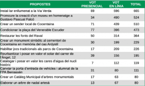 La proposta més votada ha sigut instal·lar enllumenat a la Via Verda amb 665 punts seguit de la creació d’un museu en homenatge a Gustavo Pascual Falcó amb un total de 524 vots i ocupant el tercer lloc la creació d’un sender local de Cocentaina amb 510 vots.