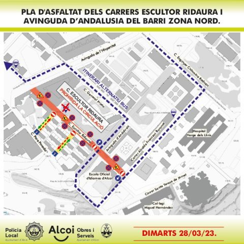 Els treballs del pla d’asfaltat i rehabilitació del carrer Escultor Ridaura i l’Avinguda d’Andalusia, en el barri de la Zona Nord d’Alcoi comencen el pròxim 28 de març i es prolongaran durant una setmana.