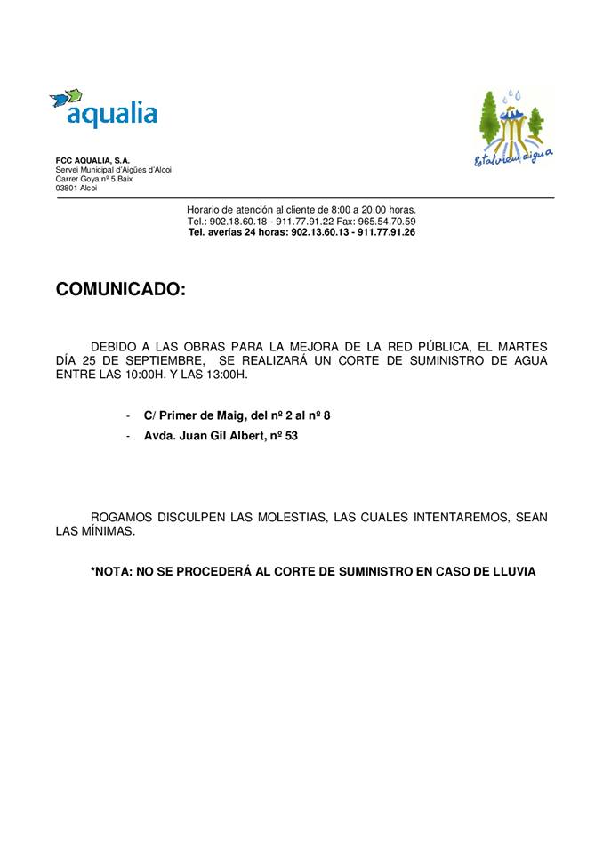 AQUALIA PROCEDERÁ A UN CORTE DE SUMINISTRO PARA LA MEJORA DE LA RED PÚBLICA