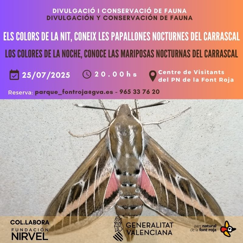 20 julio, 2025Charla y recorrido por la Font Roja para reconocer diferentes especies de mariposas nocturnas. Os invitamos a participar de la charla y recorrido por el entorno a la Font Roja. Así conoceremos las diferentes especies de mariposas nocturnas del Carrascal de la Font Roja, destacando su variedad morfológica y los colores tan llamativos de este grupo de insectos.