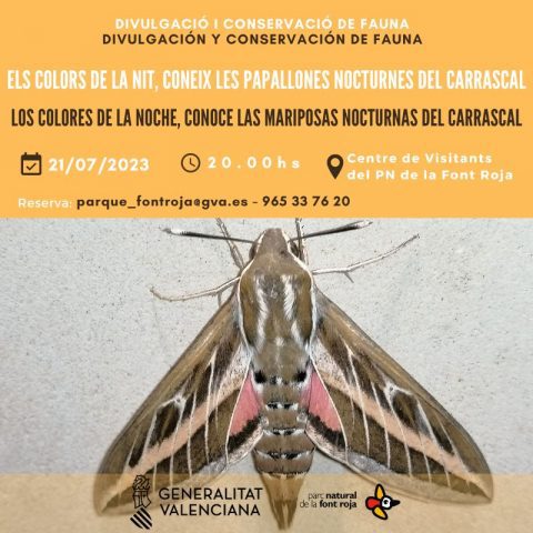 10 julio, 2023Os invitamos a participar de la charla y recorrido por el entorno a la Font Roja. Así conoceremos las diferentes especies de mariposas nocturnas del Carrascal de la Font Roja, destacando su variedad morfológica y los colores tan llamativos de este grupo de insectos.