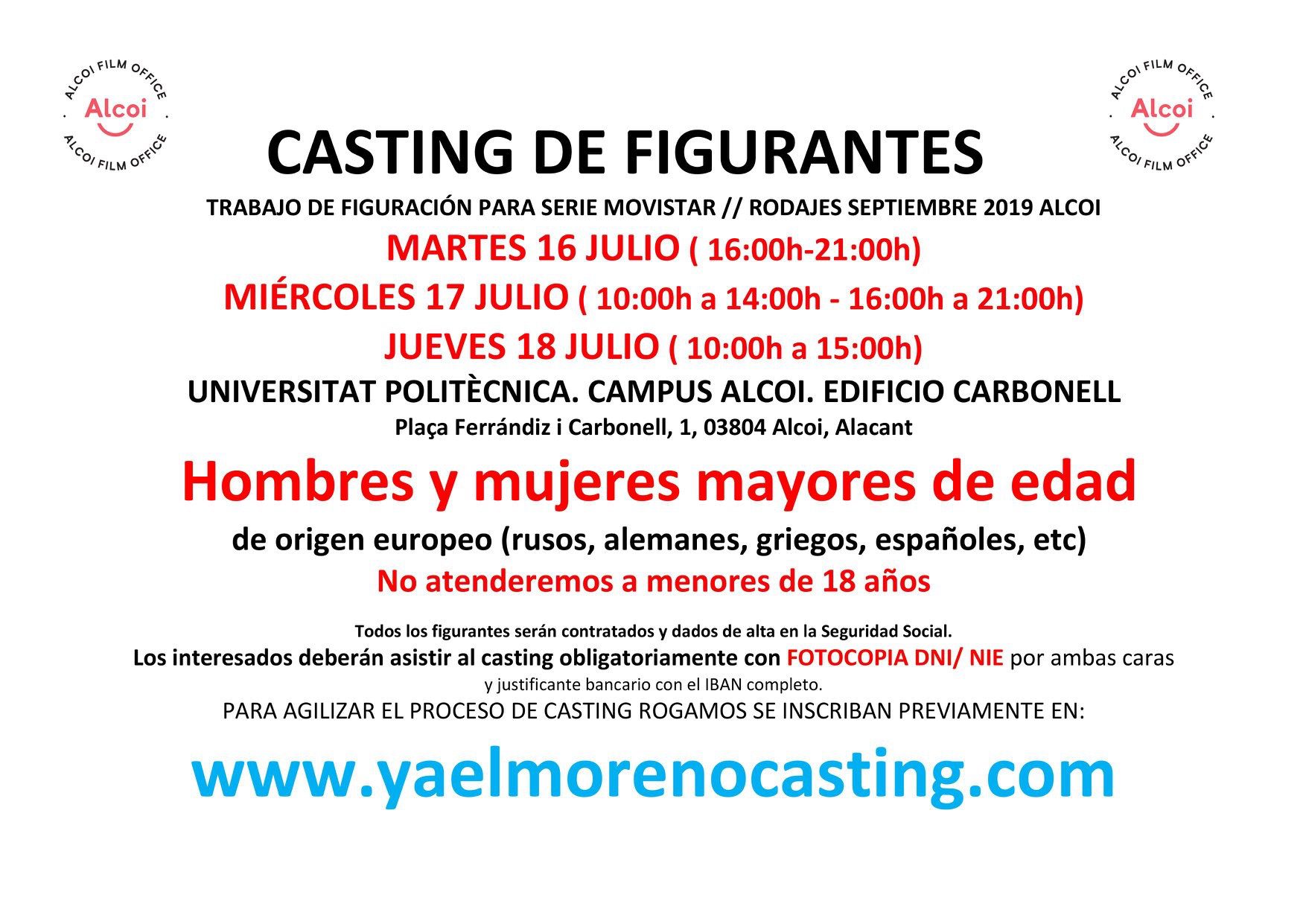Este trabajo ha dado sus frutos, y la próxima semana se llevará adelante un casting en Alcoy, concretamente en el Edificio Carbonell del Campus de Alcoy de la UPV. Será el Martes de 16:00 a 21:00 horas, Miércoles de 10:00 a 14:00 y de 16:00 a 21:00 horas y Jueves de 10:00 a 15:00 horas. Se buscan hombres y mujeres mayores de 18 años de origen europeo para hacer de figurantes. La empresa que realiza el casting indica que para agilizar el proceso recomienda hacer la inscripción previa en la web www.yaelmorenocasting.com. Las personas que vayan deberán llevar fotocopia del DNI y justificante con el IBAN del banco, por el tema de pagos.