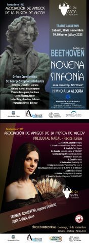 15 noviembre, 2023La 41 Temporada de Conciertos, Ópera y Danza de la Asociación de Amigos de la Música de Alcoy continuará con dos magníficos conciertos en días seguidos. El sábado 18 de noviembre con la NOVENA SINFONÍA de Beethoven en el Teatre Calderón a las 19,30 horas, y el domingo 19 en el Círculo Industrial a las 12 horas (matinal).