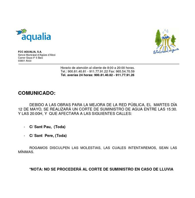 AQUALIA PROCEDERÁ A UN CORTE DE SUMINISTRO PARA LA MEJORA DE LA RED PÚBLICA