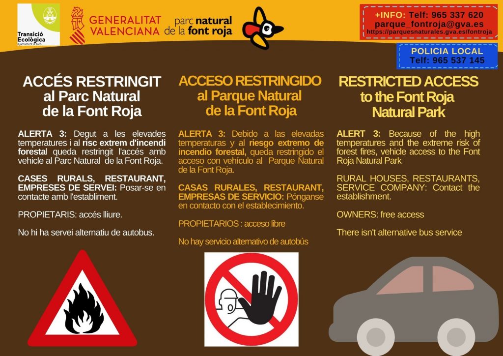 13 junio, 2022Ante la situación de ola de calor prevista para los próximos días del mes de junio 2022 y a la vista de las previsiones oficiales de situación de riesgo extremo de incendio forestal en el ámbito del Parque Natural del Carrascar de la Font Roja, se establece la restricción de accesos al parque natural mientras perdure la situación de riesgo extremo. Por lo cual, la barrera de acceso (km 0.8 de la CV-797) estará activada durante este período.