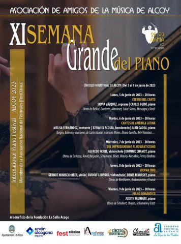 5 junio, 2023Vuelve la SEMANA GRANDE DEL PIANO | INTERNATIONAL PIANO FESTIVAL, en esta undécima edición, como miembros de la Asociación Nacional de Festivales FESTCLÁSICA. El festival va a contar de nuevo con artistas nacionales e internacionales de extraordinario prestigio, contando para ello con el patrocinio de la Diputación Provincial de Alicante y la colaboración del Ayuntamiento de Alcoy, Círculo Industrial, La Unión Alcoyana y Clemente Pianos. Todos los conciertos comenzarán a las 20 horas.