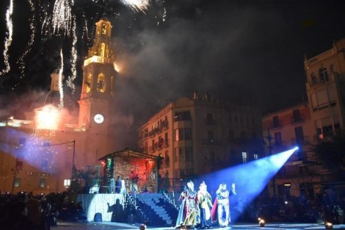 En la Cabalgata participan más de mil personas: heraldos, el portador de la estrella, pajes y antorcheros, servidores y escoltas; carros engalanados y carrozas; las cuatro bandas de música locales, los grupos de dulzainas y tabals, los grupos de danzas y la gente del pueblo. Todos conocen su papel y unen su esfuerzo para hacer calor y brillantez a la visita de Melchor, Gaspar y Baltasar, que avanzan con suntuosidad encima elegantes camellos. Ellos son el centro de la atención de miles de miradas y a ellos se acercan los más pequeños y algunos mayores para recibir una caricia o un beso. La luz de las antorchas contribuye a dotar de magia este espectáculo visual que se enriquece y hambre en suntuosidad con melodías musicales escritas para la ocasión, que interpretan las bandas de la localidad y diferentes agrupaciones de dulzainas y tabals. Un año más los pajes llevarán los regalos a pequeños y mayores.