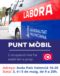 Alcoi acollirà els pròxims dies 3, 4 i 5 de maig un punt mòbil de l’Espai Labora, amb el qual la que el Servei Públic d’Ocupació i Formació de la Comunitat Valenciana vol arribar a la major part de la ciutadania i donar una major visibilitat als serveis d’informació i divulgació sobre l’orientació a l’ocupació