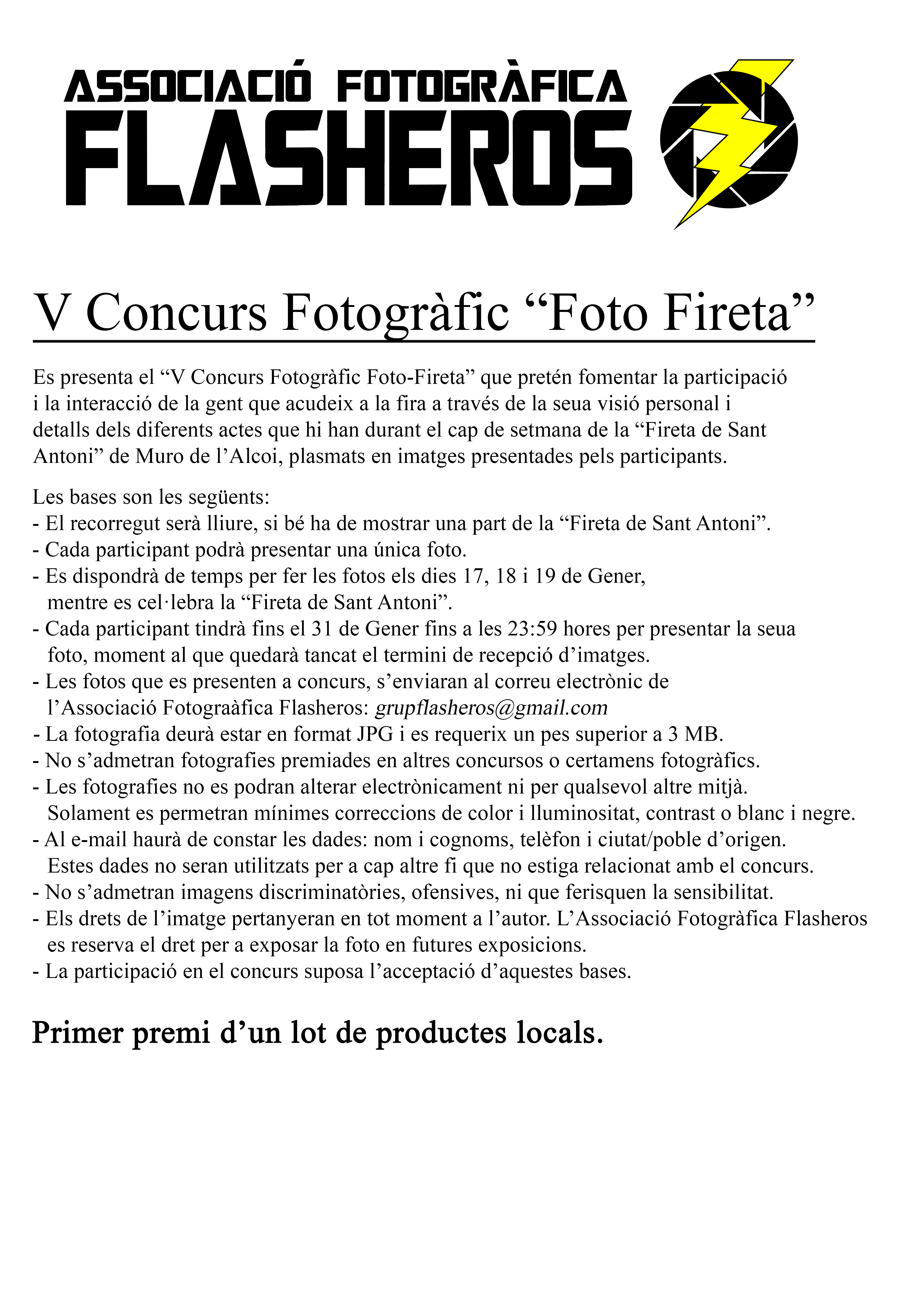 8 enero, 2020La quinta edició del concurs Foto-Fireta tindrà lloc els propers dies 17, 18 i 19 de Gener a Muro d’Alcoi amb la cel·lebració de la Fira de Sant Antoni. Durant aquestos dies, la gent que vullga concursar haura de realitzar les seues fotos, ensenyan’t la seua visió de la fira i enviar-les al e-mail grupflasheros@gmail.com per poder participar.