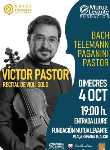 4 octubre, 2023Hui dimecres 4 d’octubre a les 19.00h en el auditori de Fundación Mutua Levante (Plaça Espanya, 16. Alcoi), tendrá Lloc un recital de violí.