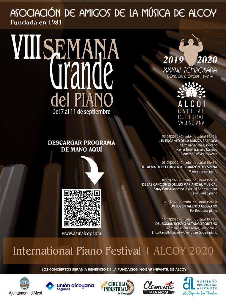 También se podrá descargar en el siguiente enlace: https://aamalcoy.com/temporada1920_archivos/semanapiano2020.pdf. Asimismo, a la entrada del Círculo Industrial, habrán dos grandes carteles con el código QR, con el que poder descargar los citados programas de mano. Se recomienda no traer consigo el programa de mano, salvo personas que no dispongan de móvil con escáner para QR.