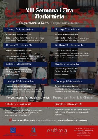 En la propuesta del muBoma vamos a vincular su figura y arquitectura con el conocimiento del Museo del Consorcio Provincial de Bomberos, tanto del propio edificio (que era una importante fábrica en época modernista) como de la profesión de los bomberos en aquellos tiempos. Tendremos tres días de puertas abiertas en el museo y además, el muBoma estará presente en la Fira Modernista del parque de la Glorieta.