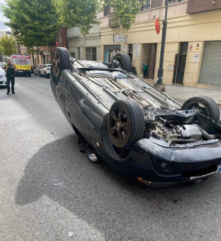 Hoy minutos antes de las 10h ha volcado un vehículo en la calle Oliver tras chocar con vehículos estacionados. COmo consecuencia del accidnete la conductora ha resultado herida. El equipo de Atestados e Informes de esta policía lleva la investigación de este accidente de trafico.