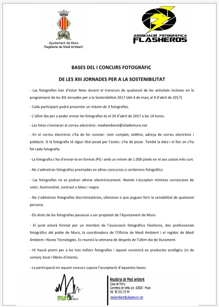 Com a novetat, l’Associació Fotogràfica Flasheros conjuntament amb l’Oficina de Medi Ambient, han organitzat un concurs fotogràfic. Consistirà en fer fotos durant alguna de totes les activitats que hi hauràn en les jornades i podràs guanyar premis molt interesants.