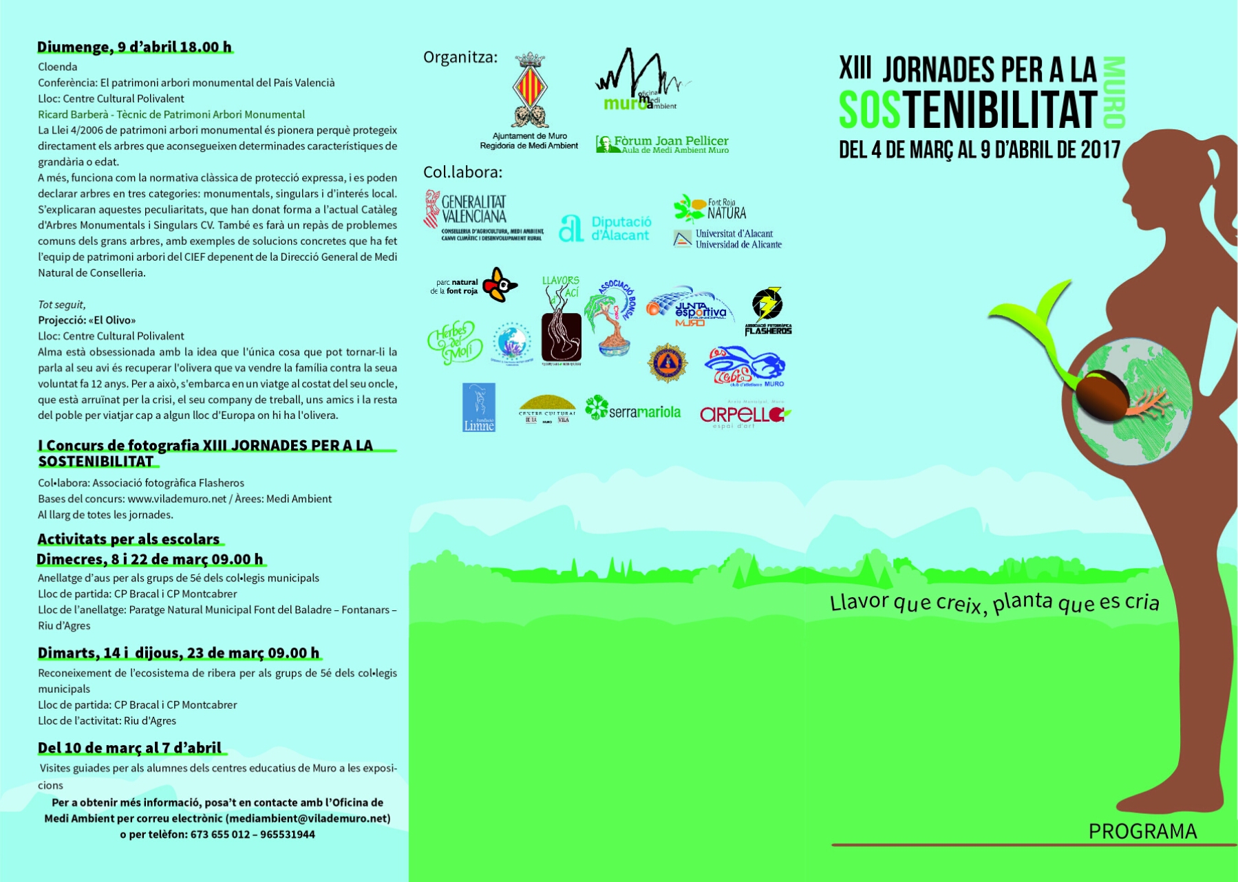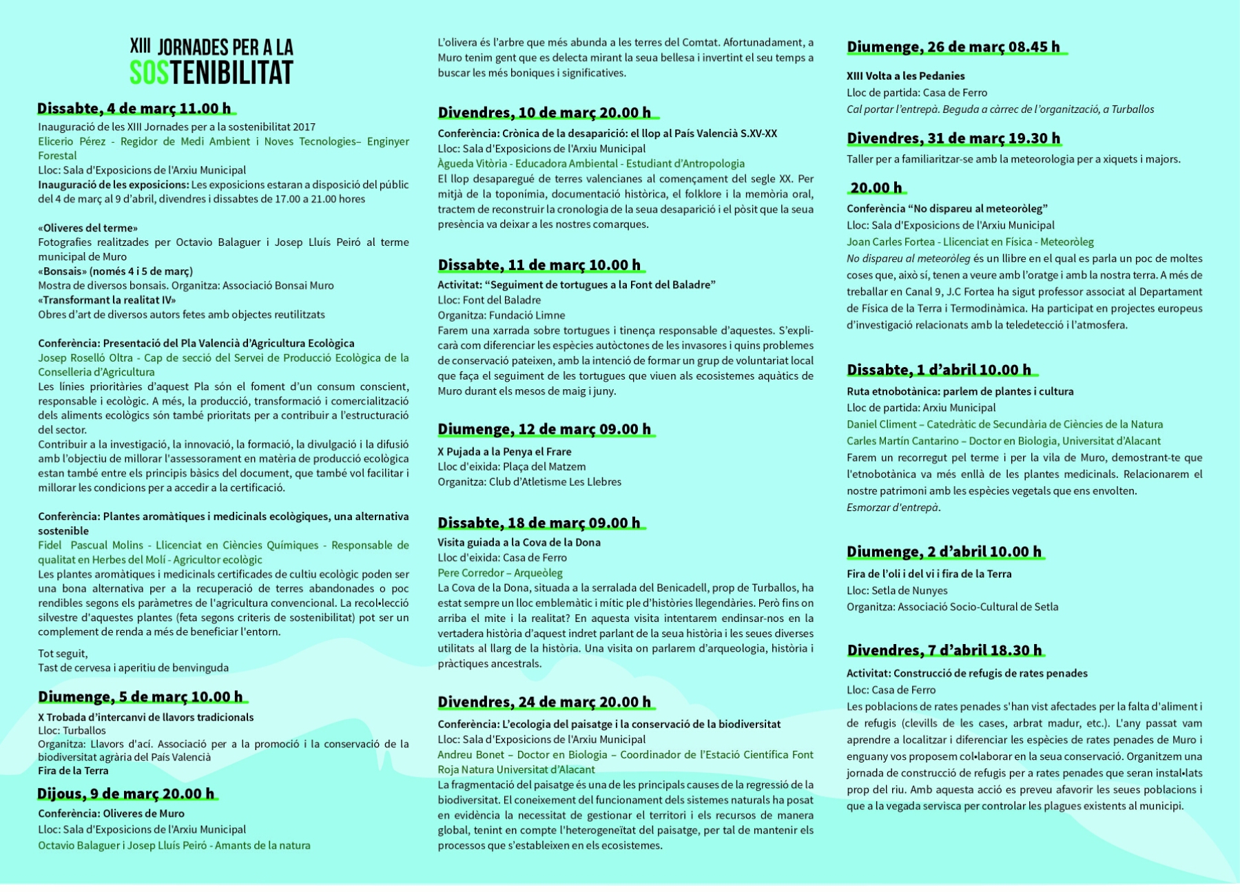 4 marzo, 2017Aquest any, a les XIII Jornades per a la Sostenibilitat de Muro, amb el slogan: «Llavor que creix, planta que es cria», l’Ajuntament de Muro ens convida a participar en les activitats que es duràn a terme del 4 de març al 9 d’abril.